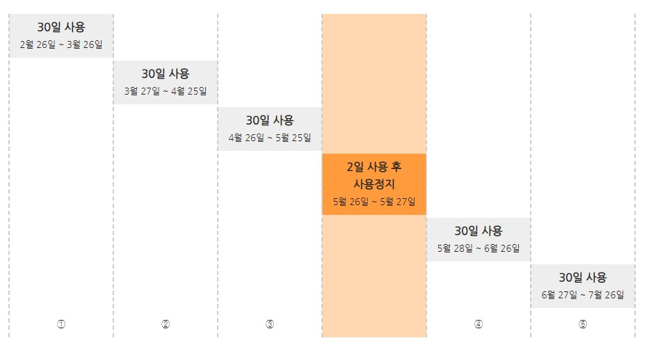 2.26.~6.30 기간중 충전하여 30일 만기 사용한 횟수가 3번일 경우 : 21,000원 환급 (7,000원x3회)