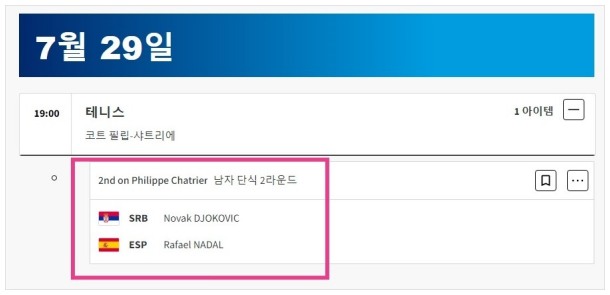 노박 조코비치 | 라파엘 나달 | 7/29 20:30 ~ 21:00 시 시작 |