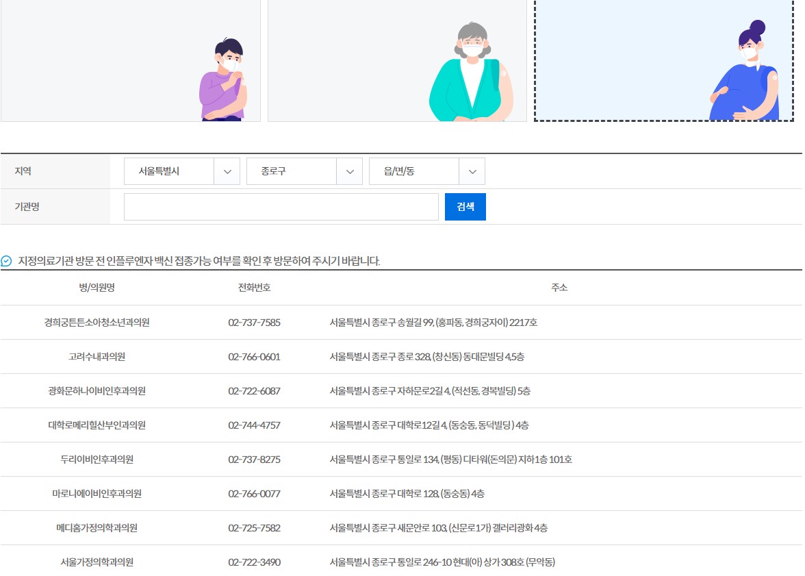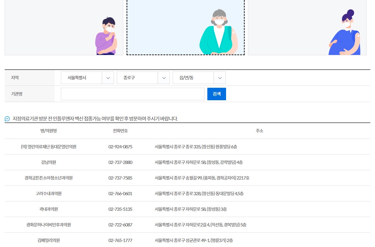 각 대상에 따라 무료 독감접종이 가능한 병원이 다르니 꼭 검색해 보시고 방문 전 인플루엔자 백신 접종 가능 여부를 확인해 보시길 바랍니다.