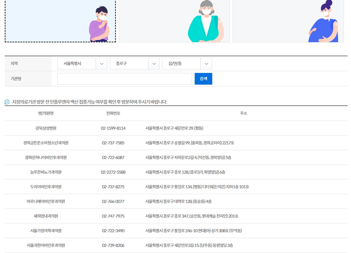 지정의료기관 및 보건소 방문 전 인플루엔자 백신 접종가능 여부를 확인한 후 방문하여 주시기 바랍니다.