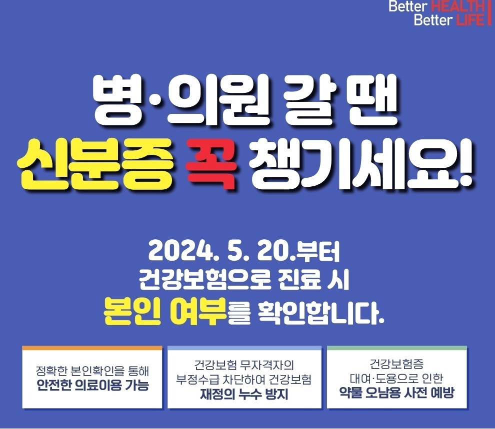 병·의원 진료 전 신분증 챙기셨나요? '24.5.20.부터 병·의원 진료 시 신분증이 꼭 필요합니다.