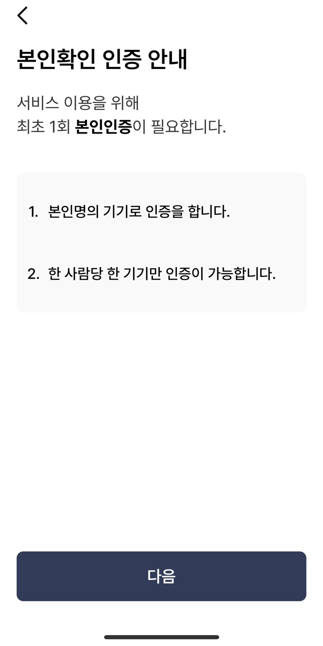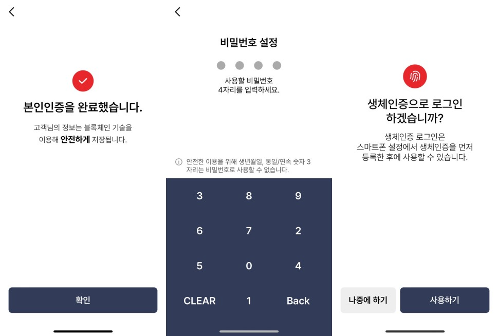 본인인증이 완료되시면 비밀번호를 설정하시고 생체인증 로그인 설정 등록을 하시면 됩니다. 물론 나중에 하기로 넘어가셔도 됩니다.