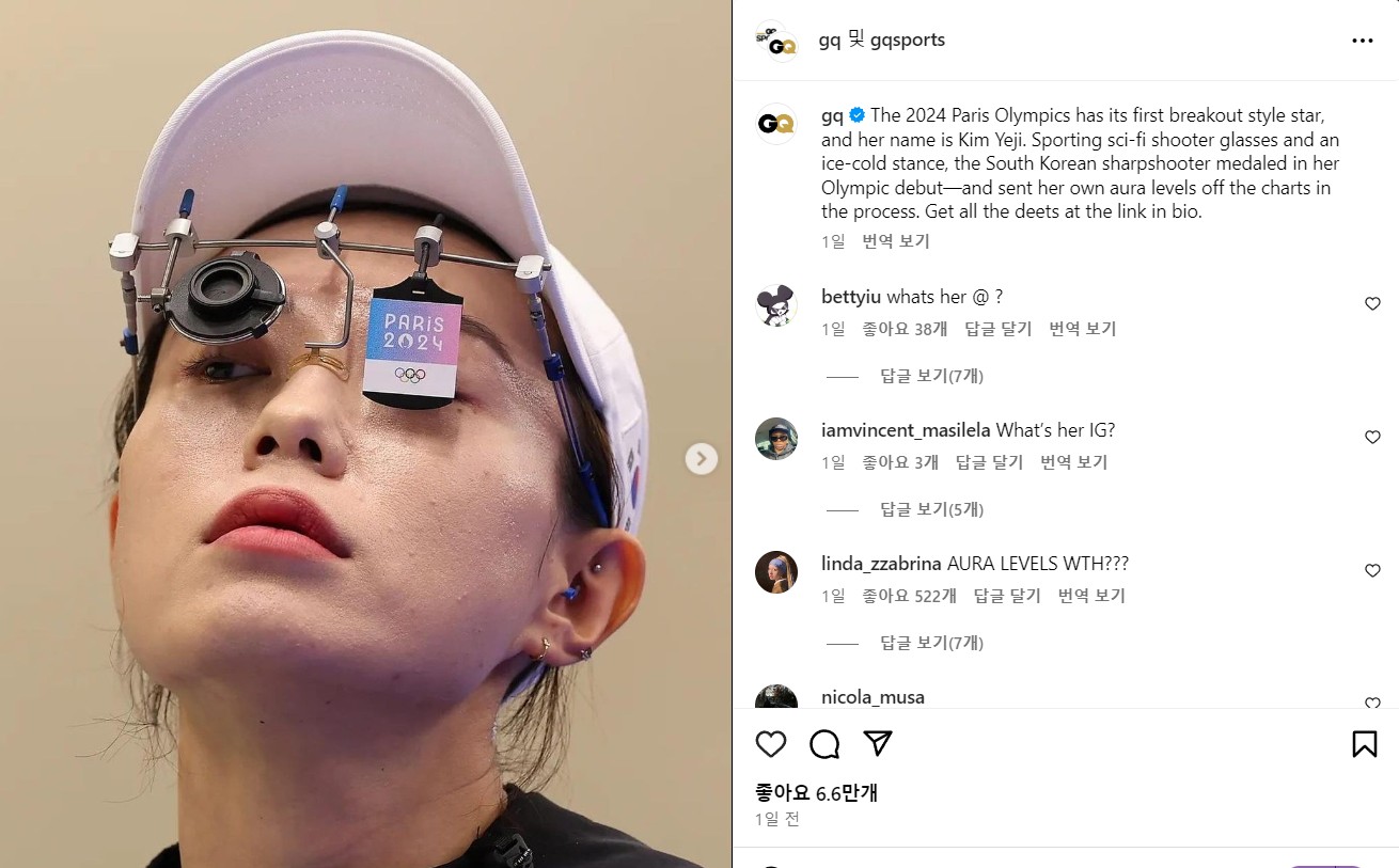 GQ 는 대한민국 사격선수 김예지가 2024 파리 올림픽에서 보여준 스타일은 공상 과학 암살자처럼 보인다며 스타탄생을 알렸습니다. 포니테일과 야구모자, 검은색 아노락과 트랙팬츠에 빨간색 끈이 달린 신발까지 유명 패션지답게 김예지 선수의 패션에 대해서도 분석을 하며 많은 관심을 보였습니다.