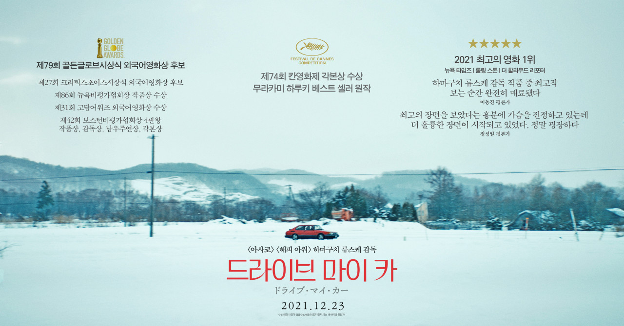 하마구치 류스케 감독이 만들어낸 영화 드라이브 마이 카는 2021 칸영화제 각본상, 2022 94회 아카데미 시상식 국제장편영화상, 79회 골든 글러브 시상식 외국어 영화상을 비롯하여 많은 상을 휩쓸었습니다. 영화는 드라이브 마이 카에서 뼈대를 차용하고 아내의 외도와 다른 내용들은 하루키의 다른 단편 소설에서 일부를 가져왔습니다. 하루키의 필력과 류스케 감독의 연출력이 만나 멋진 영화가 탄생하였습니다. 원작과 영화의 차이는 우선 소설 속 노란색 차는 영화에서는 빨간색으로 바뀌었습니다. 이유는 녹색의 산이나 나무와 대비했을 때 노란색이 별로라는 느낌이었고 소품팀에서 빨간 차를 타고 와서 그것으로 결정했다는 뒷얘기가 흥미롭습니다. 그리고 소설과 달리 안톤 체호프의 연극 '바냐 아저씨'에 대한 내용으로 많은 시간을 할애합니다. 소설은 가후쿠와 미사키의 만남으로 시작되지만 영화는 오프닝 크레딧이 나오기까지 40분가량을 아내의 이야기에 할애한다는 점도 다릅니다. 영화는 3시간에 달하는 러닝타임이지만 사람과 사람의 대화를 진지하고 신중하게 표현하여 다른 사람의 마음에 도달하는 과정을 관객들이 체험하게 해 줍니다. 하마구치 류스케 감독은 이렇게 인간의 내면을 독특한 방식으로 그려내면서 예술영화 시장에서 각광받고 있습니다. 평론가들은 영화 드라이브 마이 카를 보는 순간 매료되고 매 장면에 흥분하게 된다며 하마구치 류스케 감독의 작품 중 최고작이라고 호평하였습니다.
