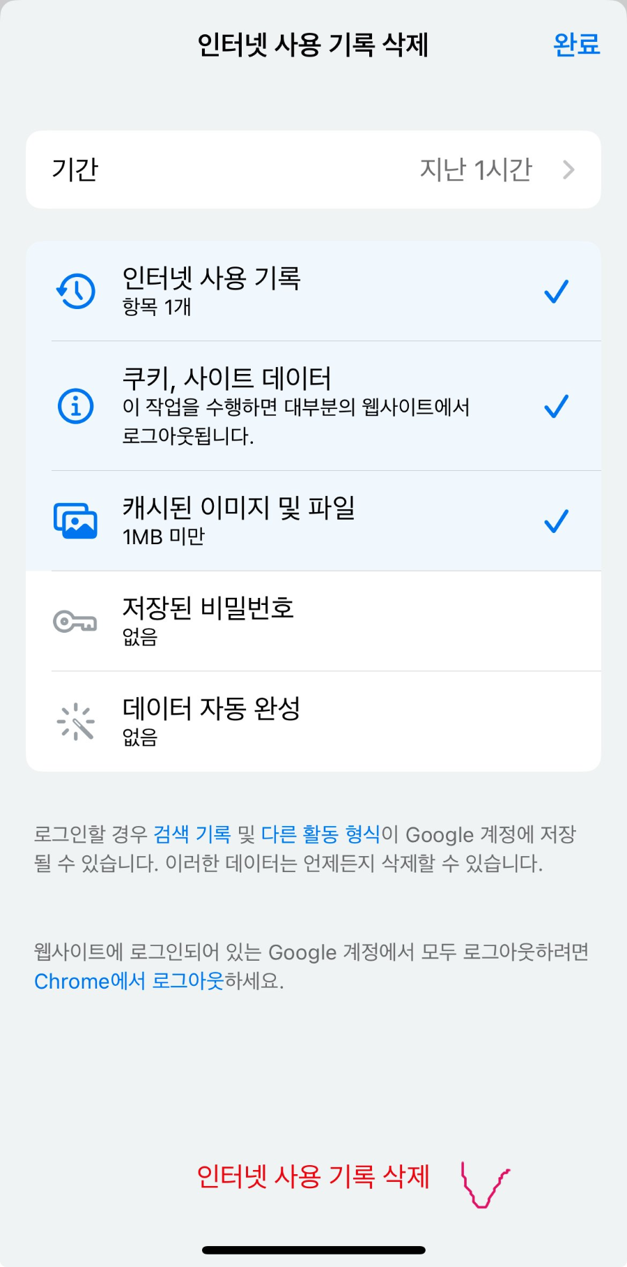 5. 가장 아래 빨강 글자로 쓰여진 인터넷 사용 기록 삭제 탭을 눌러줍니다.