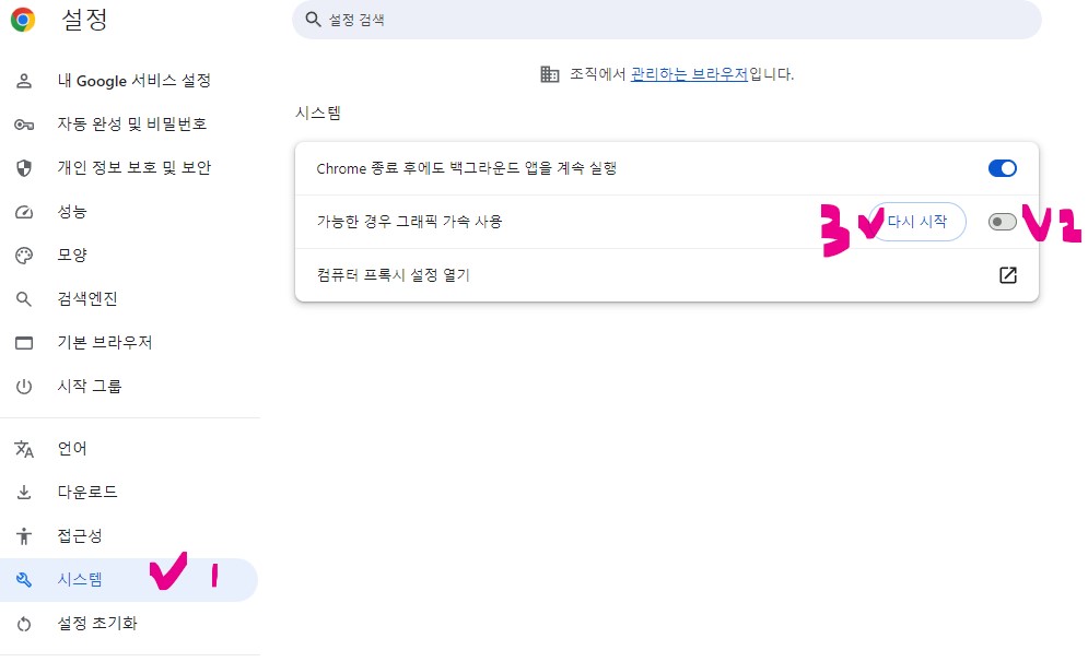3. 가능한 경우 그래픽 가속 사용 부분을 비활성화 시킵니다.