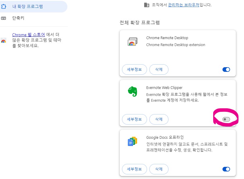 3. 사용하고 있는 확장 프로그램을 하나씩 비활성화 시키면서 오류 코드가 더 이상 생기지 않는 것을 확인합니다.
