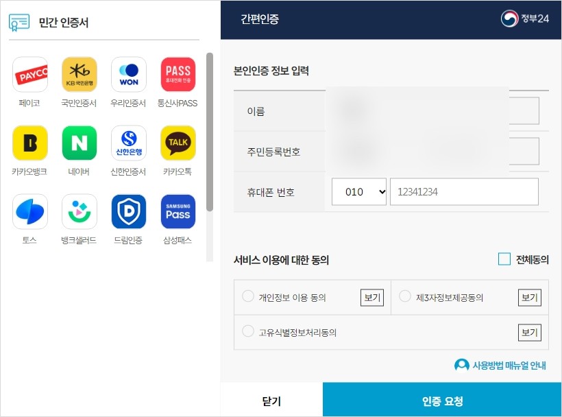 공동인증서/금융인증서 확인 후 휴대폰 본인인증