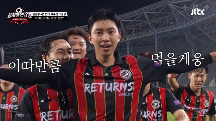 각 팀의 구단주 카드를 걸고 지는 팀의 구단주가 회식을 책임지는 내기가 걸린 게임이라 더욱 흥미진진하게 볼 수 있었습니다. 임영웅은 특히나 뛰어난 축구 실력을 발휘하여 함께 경기하였던 뭉천 뉴벤져스 팀은 물론 시청자들을 깜짝 놀라게 하였습니다. 구단주이자 선수로 팀을 이끌어내는 능력도 대단하였고 방송 중 무대에서는 볼 수 없었던 진솔한 모습들이 참 인상 깊었습니다.