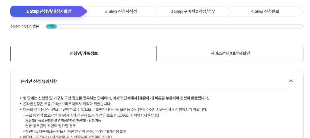 가장 먼저 개인정보활용동의 합니다. 서비스 대상, 서비스 이용 및 신청방법, 온라인 신청서 주의사항을 다 확인하시고 다음으로 넘어가면 신청인/대상자 확인 정보가 뜨고 신청서 작성, 구비서류 작성 첨부 그리고 신청완료 됩니다. 시간이 꽤 걸리니 시간 충분히 가질 수 있도록 하시길 바랍니다.