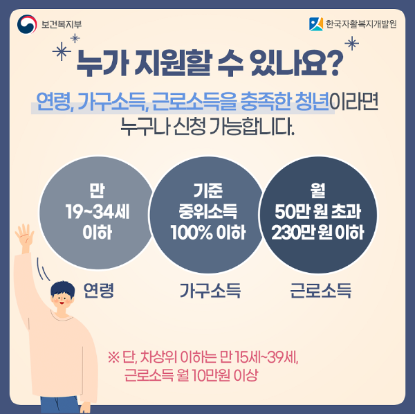 연령 : 신청시점 당시 만 19세 ~ 34세 청년 (단, 수급자 및 차상위자는 만 15세~39세)