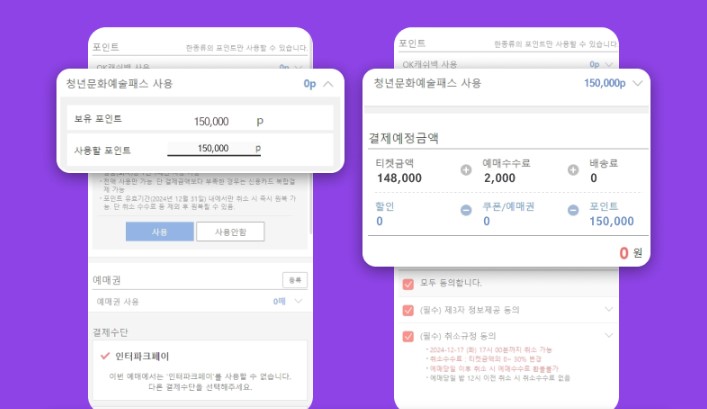 공연 예매 시 '청년문화예술패스 상품권에서 사용할 금액을 직접 입력하여 결제할 수 있습니다.