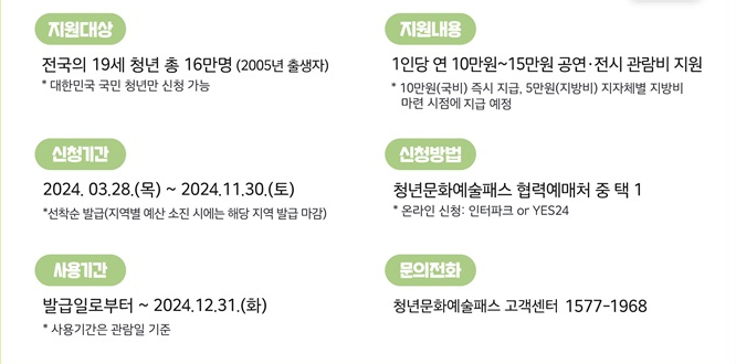 2024년 올해 19세가 되는 2005년생 대한민국 청년들은 공연과 전시 관람비를 최대 15만 원 지원받는 ‘청년 문화예술패스’를 발급받을 수 있습니다. 이 혜택은 올해 처음 시행하는 것으로 국내 거주 중인 19세(2024년 기준 2005년생) 청년이라면 소득과 관계 없이 누구나 신청할 수 있습니다. 전국 17개 시도별로 정해진 청년 수에 따라 3월 28일 오전 10시부터 신청순으로 발급합니다. 지역별로 발급 상황에 따라 조기에 마감될 수 있으니 빠른 신청이 필요합니다. 발급받은 ‘청년 문화예술패스’ 포인트는 11개 국립예술기관 뮤지컬, 클래식, 연극 등의 공연과 전시 예매에 최대 15만 원까지 즉시 사용할 수 있으며 사용기한은 오는 12월 31일까지입니다. 청년 문화예술패스를 통해 19세 청년의 문화향유 기회를 제공하고 예술창작활동에 대한 간접적인 지원과 문화예술시장 활성화를 목적으로 하는 사업입니다.