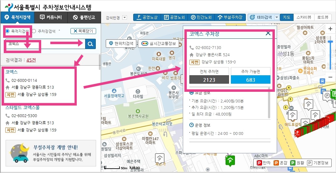 주차정보 안내시스템에서 목적지인 코엑스를 넣고 돋보기 모야을 통해 검색하고 그 결과를 하나씩 누르고 현재 상황을 확인하세요.