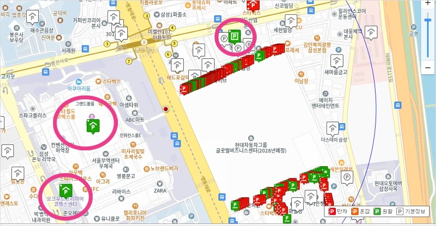 코엑스 주변으로 원활한 주차장을 찾아서 상세 내용을 보려면 P 라고 적힌 작은 버튼을 눌러봅니다.