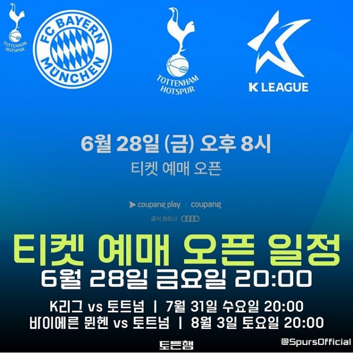 토트넘과 뮌헨 축구팀이 서울에서 경기를 합니다. 토트넘은 한국에서 2경기를 하고 갈 예정입니다. 손흥민의 토트넘 그리고 김민재 해리케인의 바이에른 뮌헨의 경기 일정과 티켓오픈, 예매 방법 정보를 알려드립니다. 토트넘의 한국행은 취소될 뻔 하다 일정을 바꿔서 결국은 진행하게 되었습니다. 한국에서의 경기가 어렵게 성사된 만큼 꼭 아래 버튼 통해서 티켓팅하시면 성공하시어 직관할 수 있길 바랍니다.