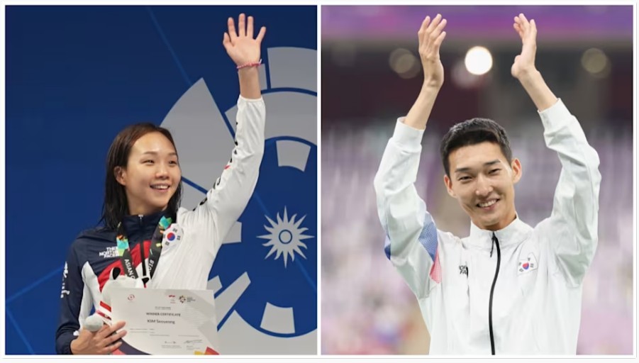 대한민국 대표선수단의 기수는 수영의 김서영 선수와 육상의 우상혁 선수입니다.