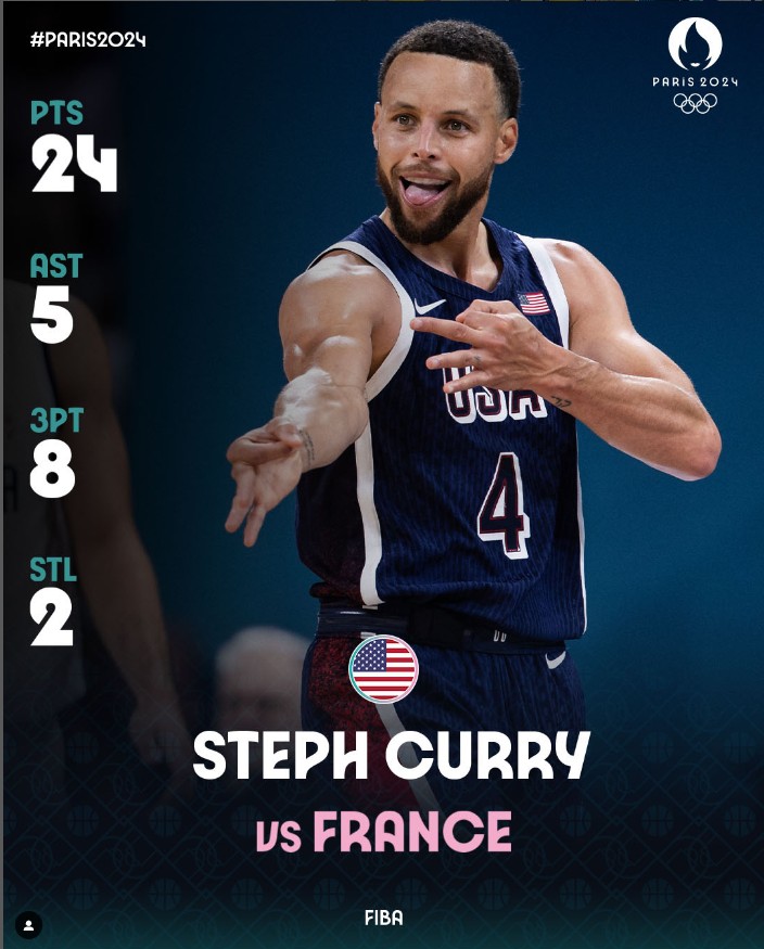 미국 대표팀 소식을 접하고서 무조건 우승일거라 생각했는데 결승에서 프랑스와의 경기는 대접전이었습니다. 끝없이 추격하던 프랑스가 4쿼터 3분을 남겨두고 3점차까지 따라잡자 승자가 누가 될지 알수 없겠다는 생각까지 들었습니다. 하지만 바로 마지막 3분 스테판 커리의 매직쇼가 시작됩니다. 3점슛 하나가 성공하고 슛폼이 올라온 커리에게 3점을 몰아주게 되는데 정말 마술처럼 모든 3점슛이 성공하면서 미국은 승리의 쇄기를 박았습니다. 마지막 스테판 커리는 농구의 신 같았습니다. 중계진이 비디오 게임에서 이런 일이 일어날 수 없다고 할 만큼 커리의 미친 경기력은 한 편의 쇼 같았습니다.