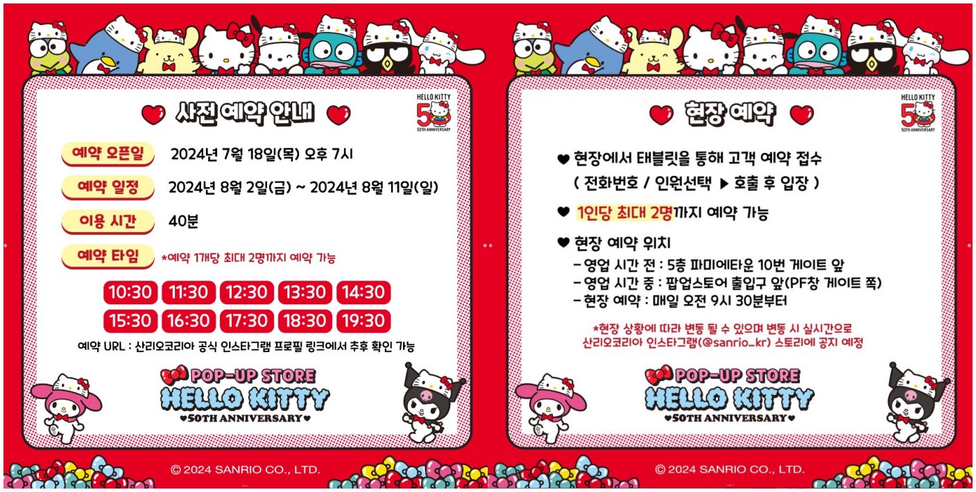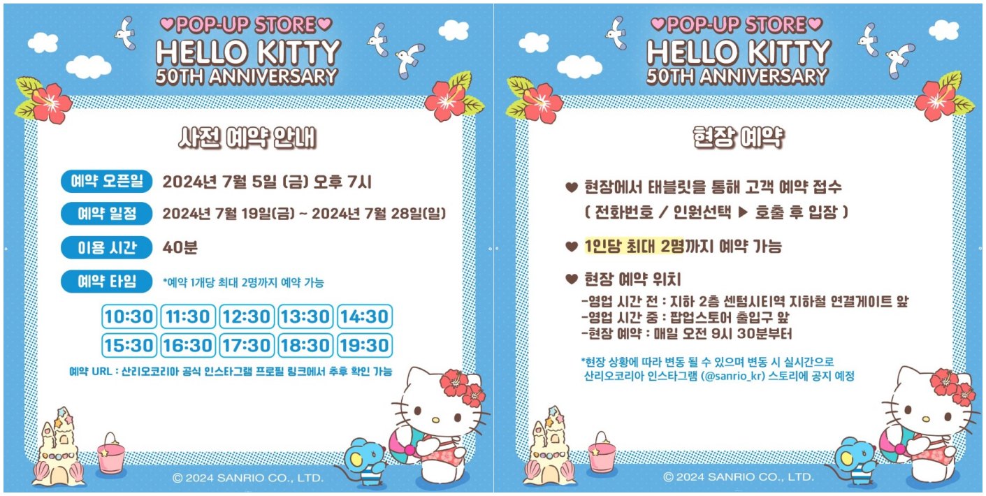 헬로키티 50주년 기념 팝업스토어는 현장 상황에 따라 예약과 판매 굿즈가 변동가능하며 변동 시 산리오코리아 인스타그램에 공지됩니다.