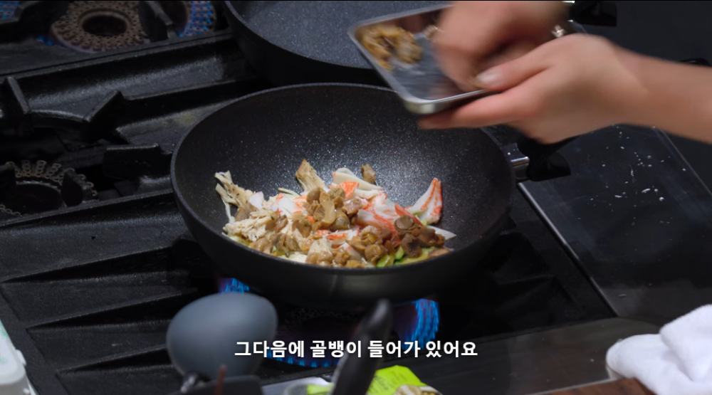 4. 닭가슴살, 게맛살, 골뱅이를 넣고 계속 볶다가 면과 숙주도 함께 넣어준다.