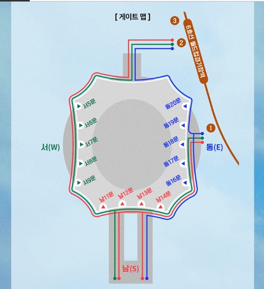 예매한 티켓은 디지털 카드 티켓으로 제공되며 구역별 다른 색상으로 구별되어 티켓의 색상과 동일한 색의 게이트로 입장하면 된다고 합니다. 좌석과 가장 가까운 게이트는 카드티켓에 표시되어 있다고 합니다.