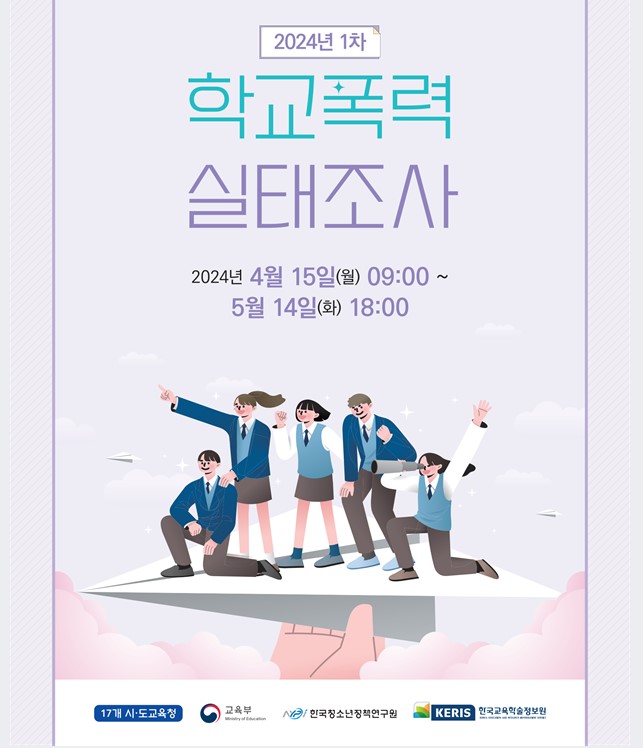 아이들 학교에 보내면서 학폭 문제로 고민과 걱정을 많이 하게 됩니다. 2024년 1차 학교폭력 실태조사가 실시되고 있습니다. 2012년부터 매해 실시되고 있는 학교폭력 실태조사는 학교폭력 예방 및 대응 정책 수립을 위한 것입니다. 실태조사로 수집된 자료는 모두가 안전하고 행복한 학교를 만들 수 있도록 활용된다고 합니다. 자세한 내용은 아래 홍보 리플렛과 가정통신문 첨부파일에서 확인하시길 바랍니다.
