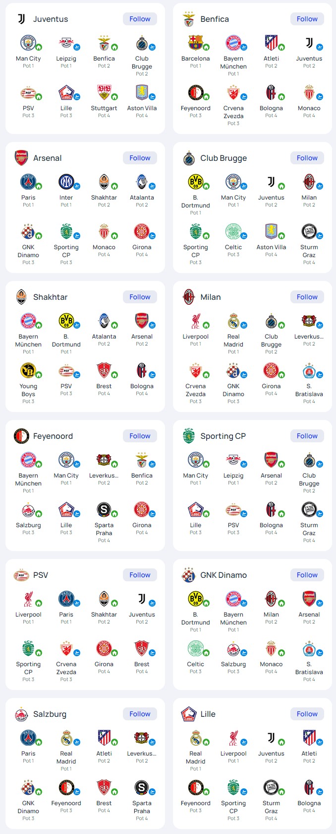 페예노르트(네)👆️ 스포팅CP(POR) 👆️ PSV 아인트호벤(NED)👆️ GNK 디나모(CRO)👆️ 잘츠부르크(AUT)👆️ 릴(FRA)👆️ Crvena 즈베즈다 (SRB)👆️ 영 보이즈(SUI) 👆️ 셀틱(SCO)👆️